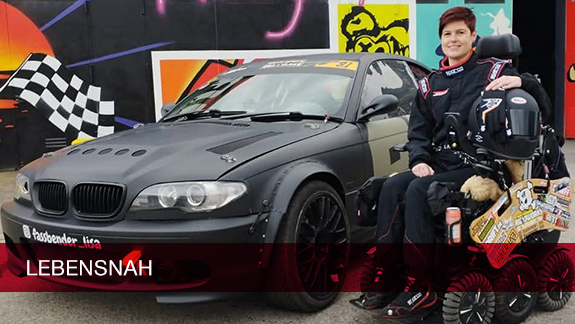 Driftsport? Google klärt auf: Bei diesem Motorsport kommt es darauf an, ein PS-starkes Fahrzeug mit Heckantrieb gezielt zum Übersteuern zu bringen und zu „driften“ – mit ausbrechendem Heck kontrollierte Fahrmanöver auszuführen. Das sieht spektakulär aus, lockt zahlreiche motorsportbegeisterte Zuschauer an und ist eine adrenalinträchtige Angelegenheit. Und mittendrin Lisa – mit großen Rollstuhlsymbolen auf den Flanken ihres BMW E46, der – logisch – mit einem Handsteuergerät versehen ist.